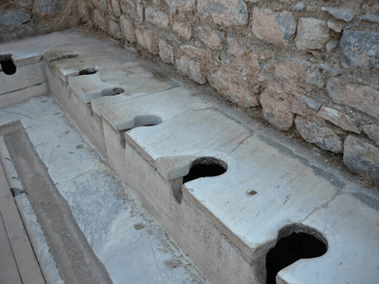 Ancient toilets. Running water below seats flushed waste to nearby river. Ephesus, Turkey